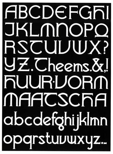 - VlaanderenChiseledNF, VlaanderenRoundNF, VlaanderenSquareNF. A free font family. These are based on an untitled work by Dutch designer André Vlaanderen from 1928. These are ugly ducklings because they mix various inconsistent styles without much thought.