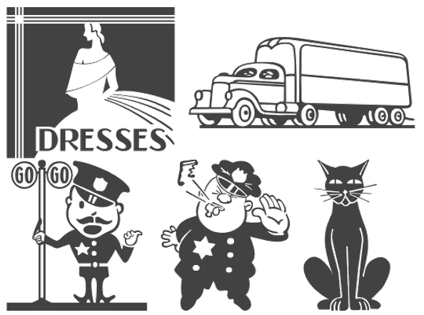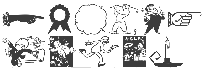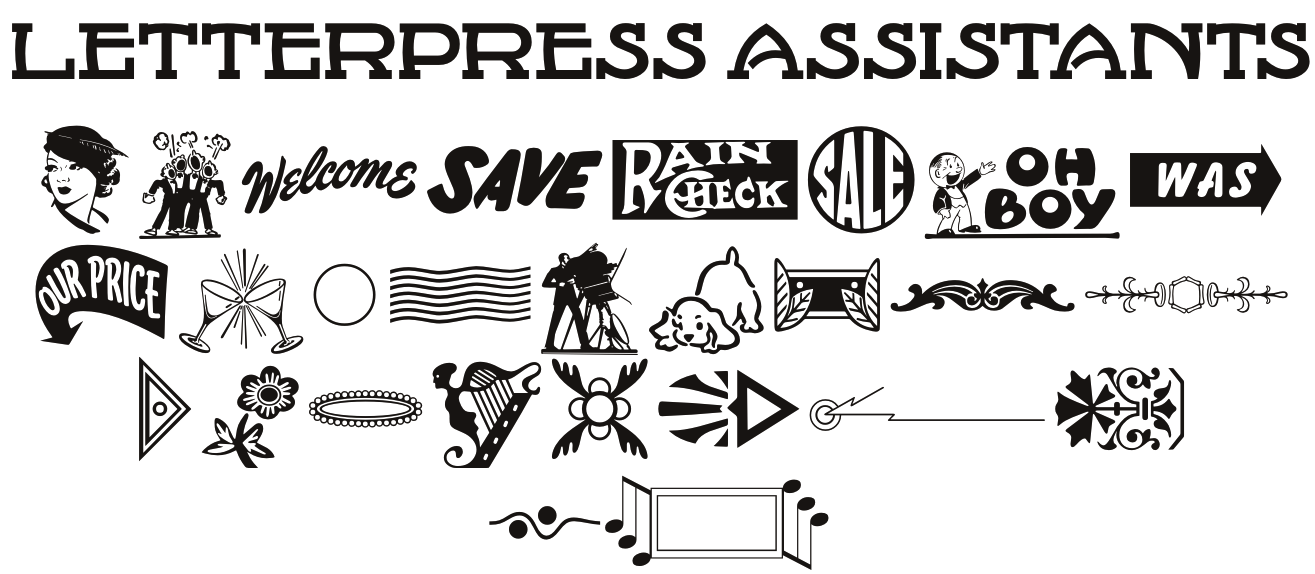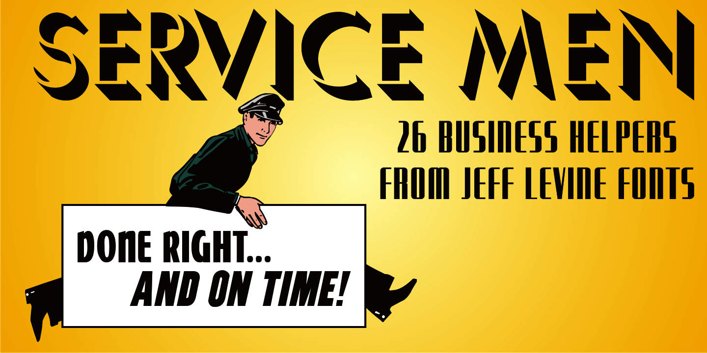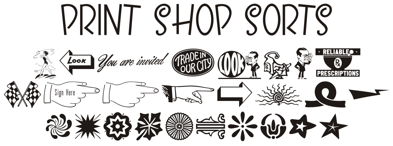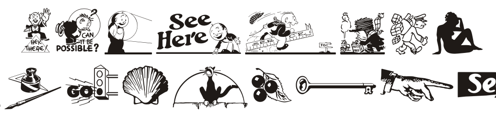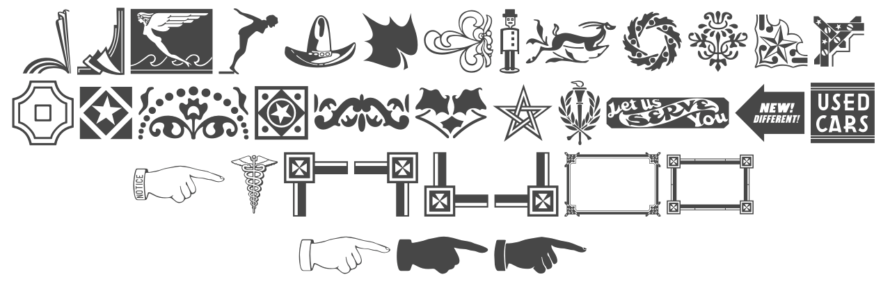 Before 2006, Jeff Levine was mostly known for his free dingbats, having made over one hundred of them. He keeps making them, but now commercially, and less frequently. The list is long though: Dingbats: 50s Yesterdings, Action is the Sequel, ActionIsJL, Alpha Test, Another Dingbat Font JL, Antique Decorations JNL (2012), Antique Embellishments JNL (2009, nice 1800 style dings, including a great fist), Antique Ornaments JNL (2009), Antique Stencils JNL (2013), Apartment-Life-JL, Artsy Parts JL, Attention Getters JNL (2009), Auto-Store-JL, Bachelor Pad, Bank-Visit-JL, Bijou, Boat Decals JNL (2008, squarish), BookshelfTitlesJL, BottomsUp!JL, Buttons-and-Switches-JL, Carnival Days, Cartoon Cavalcade (2014), City-Signs-JL, Classic Clips JNL (2015), Clown Alley JNL (2009, clown faces), Cobb-Shinn-Stock-Cuts (7 fonts), Collected-Dings-JL, Columbia Shuttle Memorial Font (2003), CroakersJL, DecoPics, Decorative Arrows JNL (2011), Decorative Elements JL, Dekka Dense, Desk Draswer JNL (2010), Ding Dong Dingbats, Dingdangits JNL, Dingfont100JL, Dingits JNL (2009, flags), DiskettesJL, Doctor's-Dings-JL, Dont Bug Me JNL (2009), Double Nines JNL (2011, a domino tile font), Drug-Store-Items-JL, ElectricalItemsJL, Embossing Seals JNL (2014), Error-MessagesJL, Even More Dings JL, FloorTilePatternsJL, FontCollectingJL (2003), Frantic, FunInTheSunJL, Funny-Faces-JL, Fun Signs JNL (2013: comprises twenty-six humorous signs from a 1930s-era sales list of products manufactured by the Koehler Sign Company of St. Louis, Missouri), Geometric Patterns JNL (2013), GoingPostalJL, Got A Ding For You JL, Graphic Arts JL, Grocery-Items-JL, Handbill JNL, Handy Dandies JNL (2014: fists), Hurricane-Preparations-JL, Ink Spots JNL (2013), It's Your Ding JL, JeffreyPrintJL (8 fonts), JewishCultureJL, Kilroy Was Here JL (very funny), Law-and-Order-JL, Leathercrafter JNL, Letter Delivery JNL (2014), Letterpress Assistants JNL (2015), Letterpress Cuts JNL (2015), Letterpress Embellishments JNL (2014), Letterpressers JNL (2015), Letterpress Extras JNL (2014), Letterpress Helpers (2014), Letterpress Nostalgics JNL (2015), Letterpress Ornamentals JNL (2014), Letterpress Pieces JNL (2015), Letterpress Stock Cuts JNL (2015), Lifeline, LittleBalerina, Loung-Lizards-Lite-JL, Message Helpers JNL (2014), Messages&Memos JL, Militaria JNL (2014), Miscellany JNL (2012), Mixed Bag O' Dings JL, Monthly Calendar JNL, Mordings JNL (2010: this includes weather dings, snow dingbats, and a beautiful quill), More Antique Stencils JNL (2013), More Printing Helpers JNL (2010, has some fists), Mr.MuellerJL, Old Favorites JNL (2009, fists), One Ding After Another JL, Outer Space JL, OuterSpace, Picnics-&-Parties-JL, Pictora JNL (2009, dings), Point Made JNL (2011, fists and arrows), Point of Sale JNL (2013), Point Taken JNL (2009, fists), Price Tag JNL (2011), Print Art JNL (2013: contains nice fists), Print Assistants JNL (2013), Print Damosel (2013), Print Embellishments JNL (2013), Print Enhancers JNL (2013), Printers Choice (2014), Printers Dingbats JNL (2015), Printers Drawer JNL (2015), Printers Helpers JNL (2015), Printers Helpmates JNL (2014, with many fists), Printers Impressions (2014), Print Helpers JNL (2013), Printers Leftovers JNL (2013), Printers Lot JNL (2014), Printers Parts JNL (2013), Printers Pictures JNL (2014), Printers Playthings JNL (2014), Printers Playtoys JNL (2014), Print Promoters JNL (2015), Print Sellers JNL (2015), Printers Stock Cuts JNL (2015), Printers Stuff JNL, Print Illustrations JNL (2013), Printing Extras JNL (2009), Printing Press Cuts JNL (2013), Printing Press Designs JLN (2013), Printing Press Elements JNL (2013), Print Marks JNL (2013), Print Oddities JNL (2014), Print Partners JNL (2014), Print Shop Classics JNL (2013), Print Shop Cuts JNL (2015), Print Shop Delights JNL (2015), Print Shop Parts JNL (2012), Print Shop Relics JNL (2014), Print Shop Sorts JNL (2015), Print Shop Treasures JNL (2015), Print Spots (2013), Printy Things JNL (2013), Prismatiq JNL, Rail Line JNL (2014), Ranger Ray's Rocketeers JL, Remnants-JL, Remnant Sorts JNL (2011: contains many nice fists and plumes), Screen Scrawls JL, Sendit Safely JNL (2010), Service Men JNL (2015), Shinn Kickers (2014: after Cobb Shinn's cartoon characters), Shopping Center JL, Sign Helpers JNL (2009, a collection of silhouette images carefully redrawn from two distinct sources, the Webway sogn kits of the Holes-Webway Company of St. Cloud, MN, and the cling vinyl sign kits made in the 1950s and 1960s by the Joseph Struhl Company (now known as Magic Master Industries)), Silhouettes&StuffJL, Silly-Symbology-II, Silly-Symbology-JL, SimplerTimesJL, Sixties Symbols JNL (2009), SmallTalkJL, Son of the Bride of Foo JL, Star Time, Star Time 3 and 4, Star Time Too, Storm-Track-JL, Sunbursts JNL (2013), SunDings, Sundings2JL, SymbologicaJL (2003, has smilies), TaxingMomentsJL, TeeVeeSet, These Foolish Dings JL, Things-Collected-JL, TimePiecesJL, Toddler JNL, Top 40 JL, Trinkets JL, Tune Up JNL (2015: a musical symbol font), Typesetter Helpers JNL (2014), Typesetter Trinkets JNL (2014), Typesetter Treasures JNL (2014), Typesetter Ornaments JNL (2012), Vintage Stencil Motifs (2014), VitaminShopJL, Whatzis JNL (2009, question marks), Winner-Take-All-JL. - Alphadings: Looky Here JNL (2009, alphadings), Love Notes JNL (2011), Sensual Initials JNL (2009, alphadings after his own French Art Initials JNL), Suninitials JNL (2008: alphadings), Eurasian Stenciinitials JNL (2010).