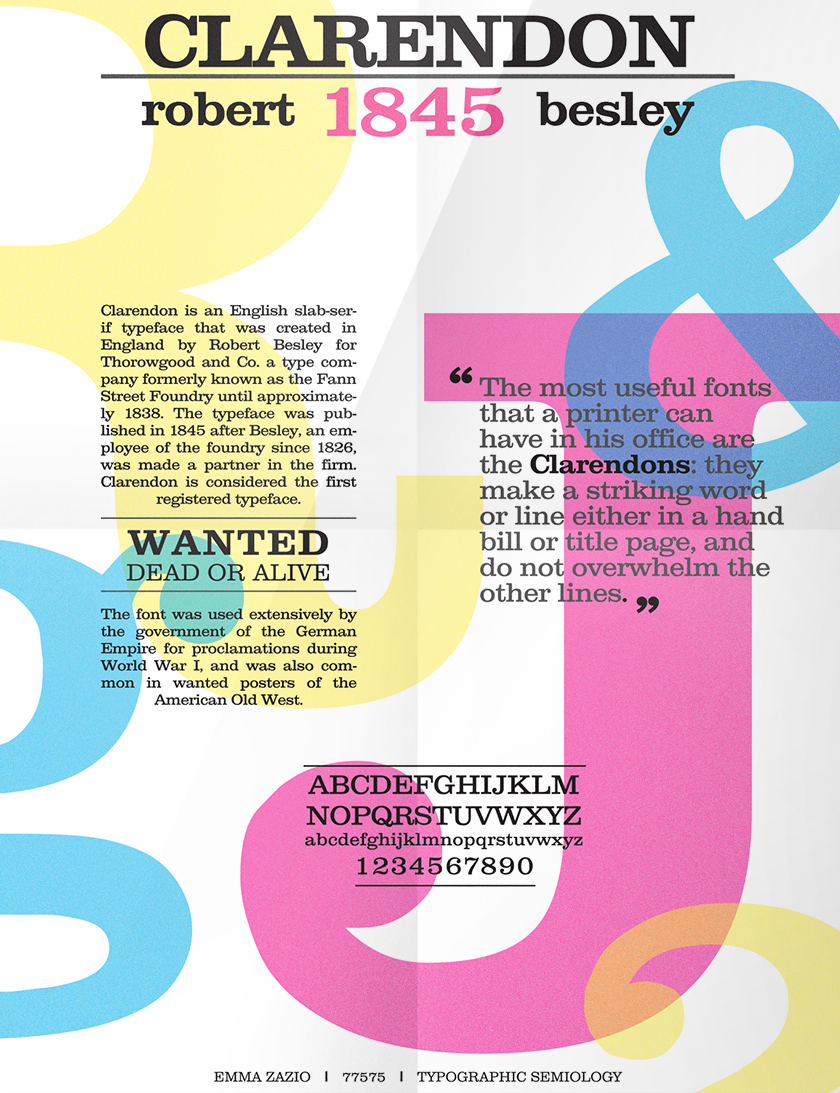 The original Clarendon is due to Robert Besley (1845). Robert Bringhurst writes: Clarendon is the name of a whole genus of Victorian typefaces, spawned by a font cut by Benjamin Fox for Robert Besley at the Fann Street Foundry, London, in 1845. These faces reflect the hearty, stolid, bland, unstoppable aspects of the British Empire. They lack cultivation, but they also lack menace and guile. They squint and stand their ground, but they do not glare. In other words, they consist of thick strokes melding into thick slab serifs, fat ball terminals, vertical axis, large eye, low contrast and tiny aperture. The original had no italic, as the typeface had nothing of the fluent hand or sculpted nib left in its pedigree. Mac McGrew adds: Clarendon is a traditional English style of typeface, dating from the 1840s, the name coming from the Clarendon Press at Oxford, or, according to some sources, from Britain's Earl of Clarendon and his interest in that country's Egyptian policies. (Such faces were classified as Egyptians, and inspired such later designs as Cairo, Karnak, Memphis, and Stymie.) Early Clarendons were used primarily as titles and display faces, for which their strong and sturdy nature was well suited. They have the general structure of romans, but lack the hairlines typical of those faces. Being heavier, the traditional Clarendons were often used as boldfaces with romans, before the family idea provided matching boldface designs. McGrew continues his discussion by pointing out various revivals and typefaces with strong similarities: Similar faces were known as Doric or Ionic, before more individualized type names became common; in fact, all three names were sometimes used interchangeably. Most foundries had versions of Clarendon, and sometimes Doric and Ionic, in the nineteenth century, but most of these faces were obsolescent by the turn of the century. However, a few were copied by Linotype, Intertype and Monotype, and thus given a renewed lease on life. Clarendon Medium of BB&S was formerly known as Caledonian. ATF had a similar typeface known as Ionic No. 522. Keystone showed Clarendon Condensed in 1890. Clarendon [No. 51 of BB&S was called Winchendon by Hansen, and extended to 48-point. Like many pre-point-system faces, some foundries adapted them to point-system standards by casting them on oversize bodies, others on undersize bodies with overhanging descenders. In the later 1950s Stephenson Blake in England revived several of these early Clarendons under the new name of Consort, which became a popular import (and the source of some of our specimens). Consort Bold Condensed is said to be the first Clarendon, of 1845. (Some added members of the Consort family are noted under Popular Imports in the Appendix.) In 1953 a new version of Clarendon was developed by Hermann Eidenbenz for the Haas Typefoundry in Switzerland and later acquired by Stempel in Germany. The Haas Clarendon was copied by Linotype in 1966, in light and bold weights, and about the same time Ludlow brought out three weights of essentially the same face. This was created primarily to set the newspaper ads of a large department store, but it was a good addition to the resources of Ludlow. ATF commissioned a modernized rendition of Clarendon from Freeman Craw, and this was brought out in 1955 as Craw Clarendon (q.v.). About 1961 Monotype brought out Clarendon Bold Extended, similar to Craw Clarendon but heavier. Also see Ionic, News with Clarendon, Manila. |