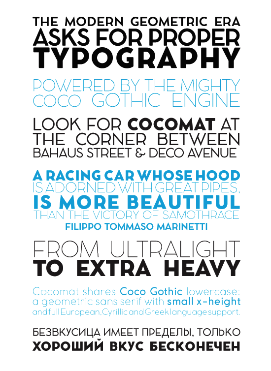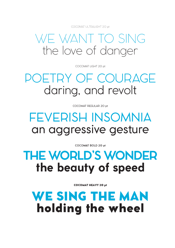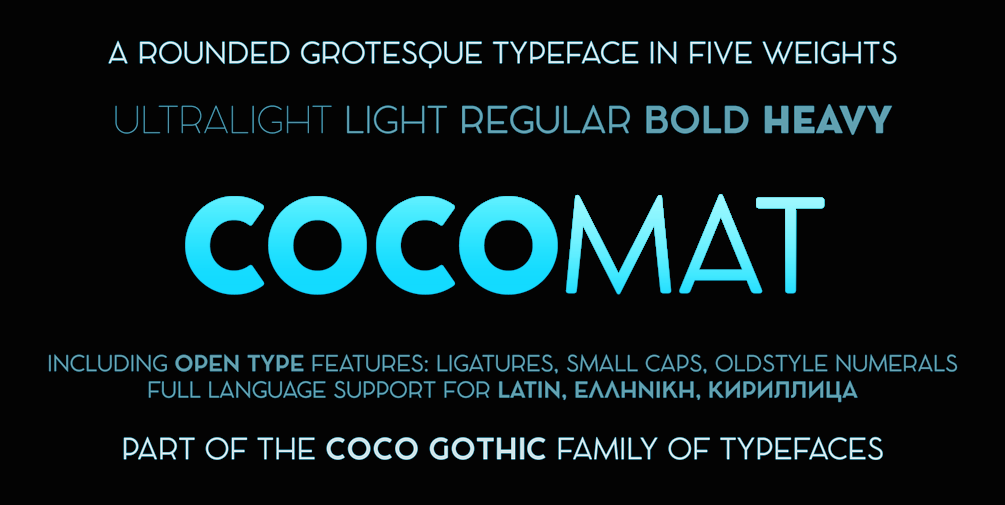 Studio Kmzero is an Italian design firm in Firenze consisting of three graphic designers, Francesco Canovaro, Debora Manetti, and Cosimo Lorenzo Pancini. Debora Manetti (Florence, Italy) designed Sala de Fiestas (2005-2006, free download at OFL), inspired by a handpainted sign for a ballroom on the island of Fuerteventura. Arsenale White and ArsenaleBlue (2009) are children's hands, done by Cosimo Lorenzo Pancini, Francesco Canovaro, Andrea Mi, Debora Manetti, Katiuscia Mari and Jonathan Calugi. At Kmzero and Zetafonts, she designed the hand-printed Panforte family in 2011. Panforte Serif is free at Dafont. The rounded geometric sans family Cocomat (2015, Zetafonts, by Cosimo Lorenzo Pancini, Debora Manetti and Francesco Canovaro) was inspired by the style of the twenties and the visions of italian futurists like Fortunato Depero, Giacomo Balla and Antonio Sant'Elia. She also codesigned the successful Cocogoose and Coco Gothic typefaces in 2015. |