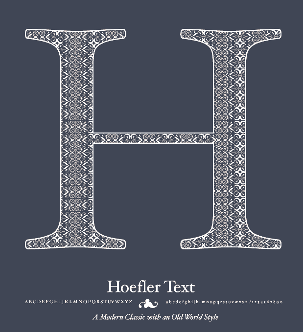 - Hoefler Text. Jonathan Hoefler, 1991. Designed for Apple to demonstrate advanced type technologies it reintroduced type design traditions once central to fine printing like ligature sets, engraved capitals, ornaments and arabesques.