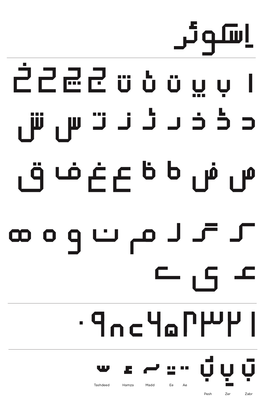 During his studies at IndusValley School of Art and Architecture, Muniba Rasheed (Karachi, Pakistan) created the Urdu typeface Isquare (2014). |
