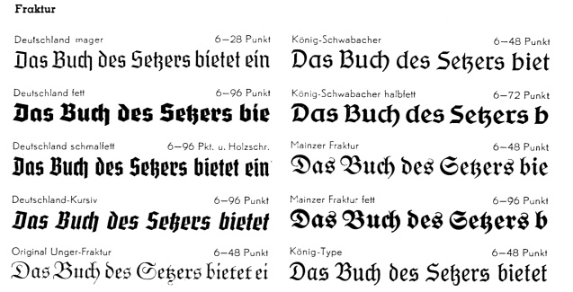 Typefaces are classified into Fraktur (blackletter) and Antiqua (for Genzmer, this means