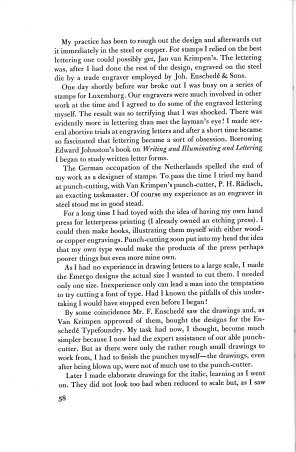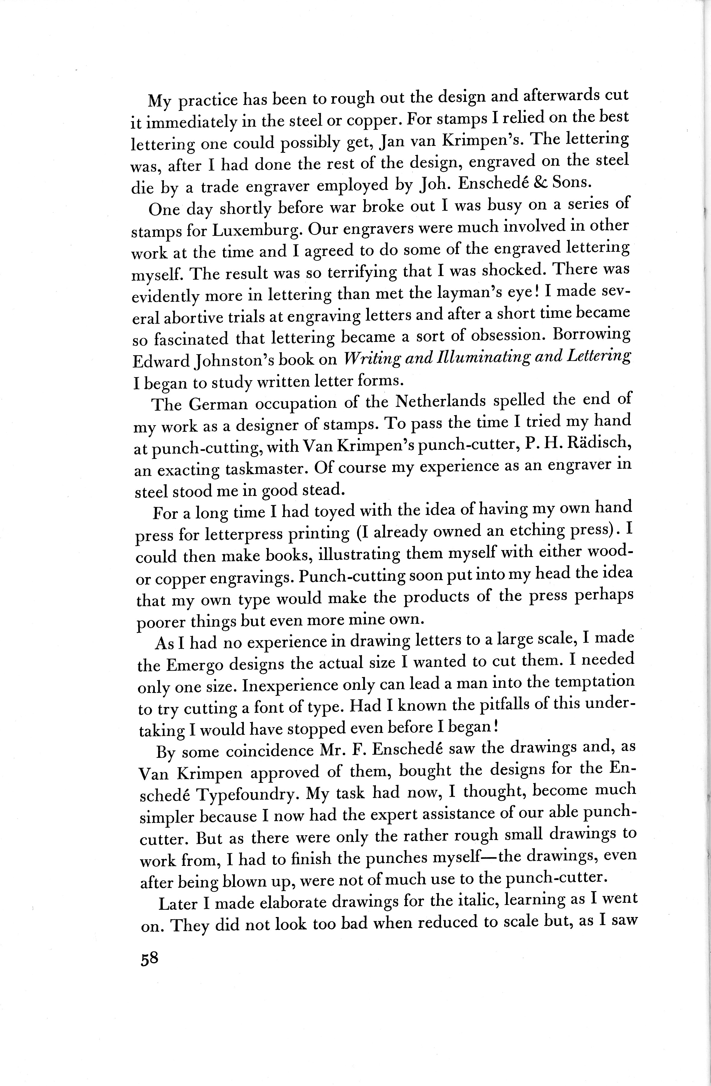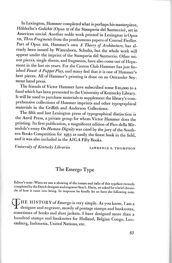 The Emergo Type is an article by Sam L. Hartz about his never published typeface Emergo (1949). It appeared in PAGA, volume 2, number 3, pages 57-60, 1954. A specimen of Emergo is included below. The article explains his cooperation and apprenticeship with Jan Van Krimpen and P.H. Rädisch (Van Krimpen's punch-cutter), and his hopes of using Emergo in his press and of his plans of spending time at Officina Bodoni in Verona with Giovanni Mardersteig.